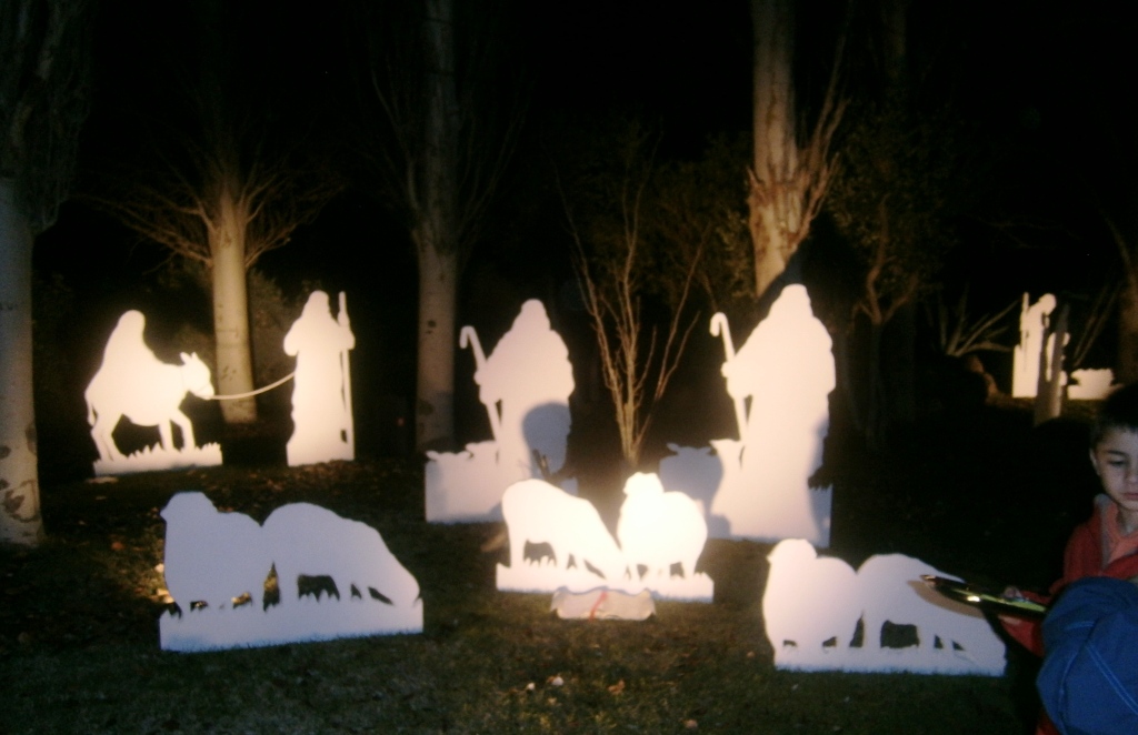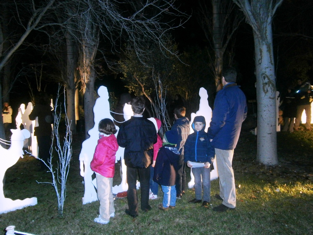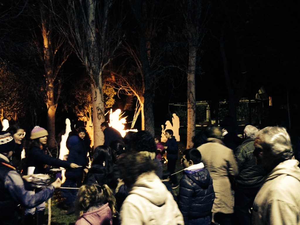 A las 19 hs comenzó a sonar la música y se encendieron los focos que iluminaban las siluetas de corcho blanco mientras dejaban ver a las familias que custodiaban cada escena. Le siguió una breve explicación de lo que estábamos viendo y a continuación, las familias leyeron en orden cronológico el texto que daba sentido a su escena. Después del cierre y los agradecimientos, todo el mundo pudo disfrutar de un chocolate caliente y dulces. Como recuerdo, todos los asistentes recibieron unos colgantes de goma EVA hechos a mano con el texto bíblico, uno diferente por cada escena. ¡Menudo trabajo!