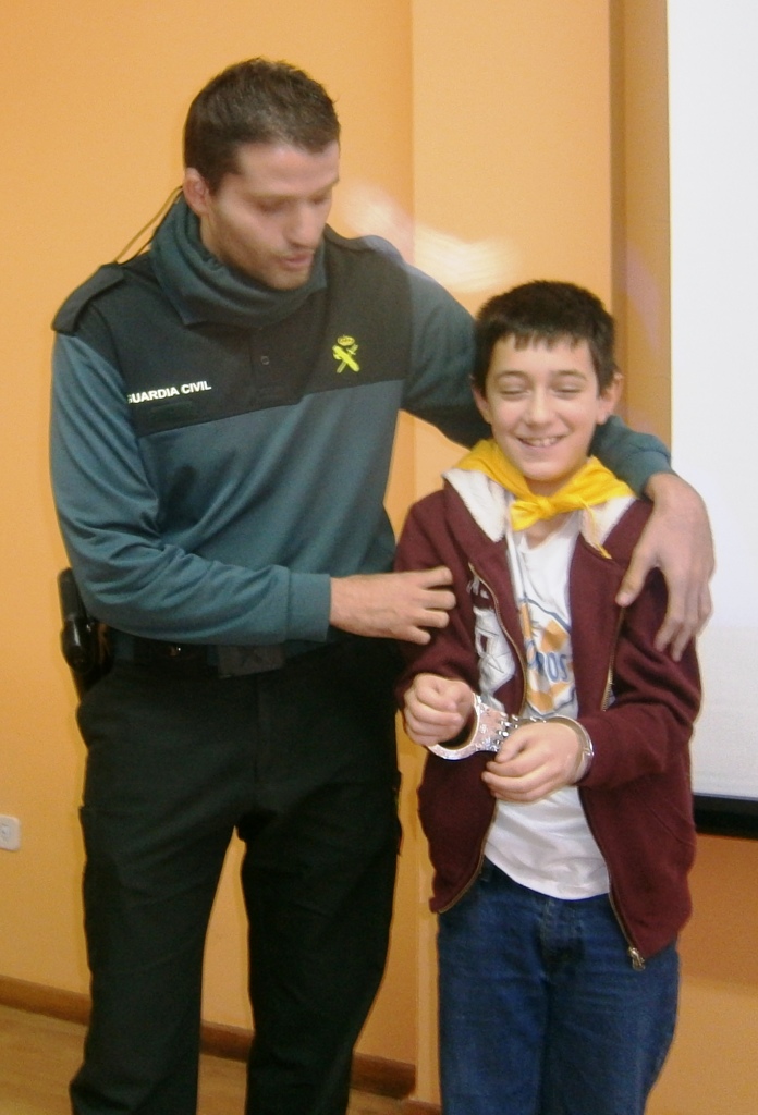 Al final de la charla, estos atentos guardias nos permitieron hacerles preguntas de todo tipo relacionada con su profesión. En la foto vemos unos de los agentes procediendo a detener a uno de los preguntones. Se les ve demasiado alegres para ser verdad. La pregunta más personal: ¿Por qué tú te has dedicado a esto?