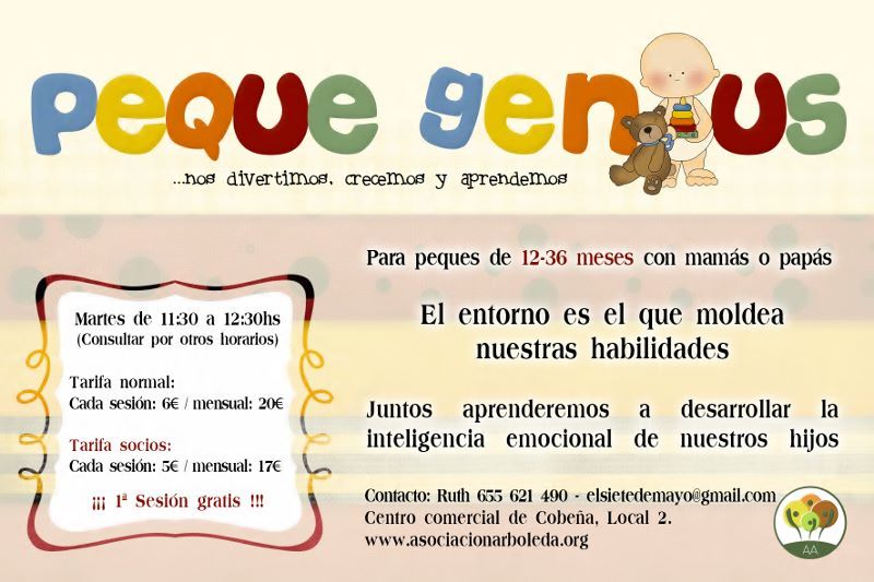 Todos los martes, de 11:30 a 12:30 hs en nuestro local. Tienes todos los detalles y un formulario para apuntarte en la página de Pequegenius (pincha). También puedes contactar con Ruth al 655 62 14 90.
