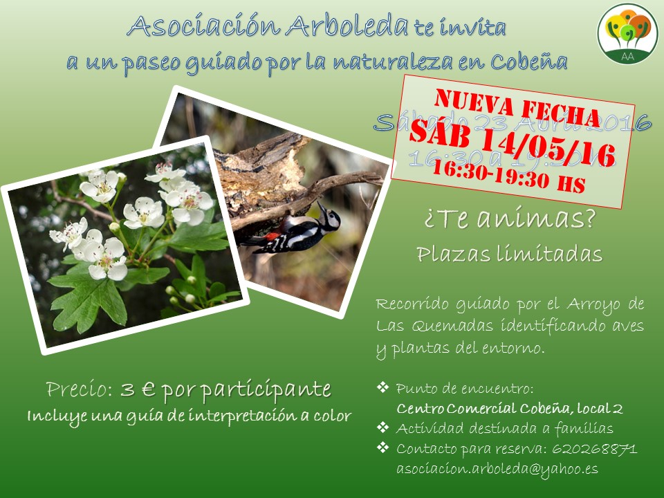 Y no solo eso. Esta salida es especialmente adecuada para ellos, para que observen y distingan por sí mismos la gran diversidad de aves existente en el entorno de Cobeña. El recorrido transcurre tranquilamente por el Valle Arriba, a las márgenes del Arroyo de las Quemadas. Nos detendremos para observar las aves que aparezcan, intentándolas identificar con la guía que recibiremos cada uno. Unos prismáticos serán de gran ayuda. Lo mismo haremos con las plantas que supongan un interés particular, algo que será mucho más fácil, puesto que podemos acercarnos a ellas todo lo que queramos sin que se vuelen o salgan corriendo como otras especies animadas. Es importante llevar agua, protección solar y un boli para hacer anotaciones.