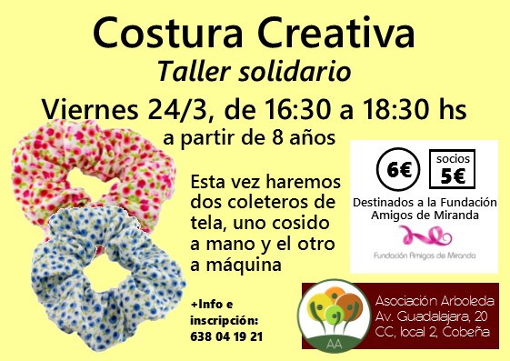 Esta sesión está pensada para cualquier persona a partir de 8 años de edad y se llevará a cabo en nuestro local el viernes 24 de marzo de 2017, de 16:30 a 18:30 hs. Cada participante tendrá la oportunidad de realizar dos coleteros: uno cosido a mano y otro a máquina. Todos los materiales están incluidos en el precio del taller y los fondos recaudados se destinarán a la Fundación Amigos de Miranda, a iniciativa de nuestra socia y amiga Teresa. Os agradecemos vuestro apoyo y os esperamos con mucha ilusión.