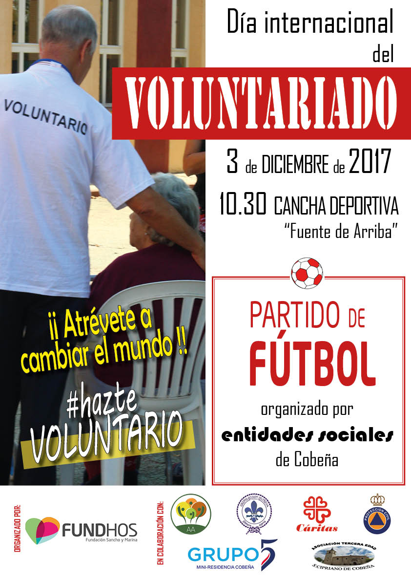 El 3 de diciembre, con motivo del Día Internacional del Voluntariado, las entidades sociales de Cobeña vamos a celebrarlo jugando un partido de fútbol, entre voluntarios, en la Cancha Deportiva “Fuente de Arriba”.