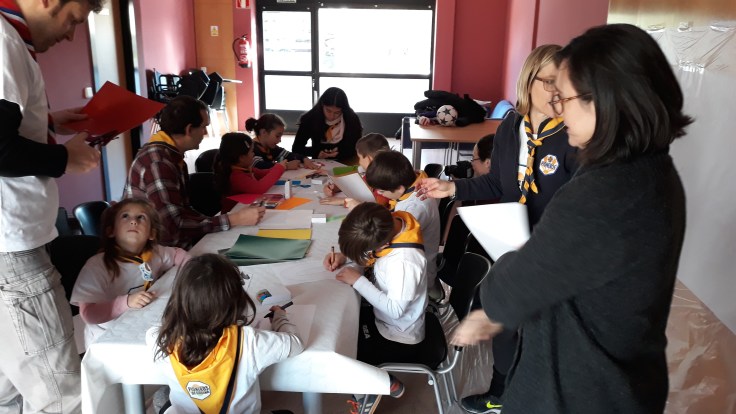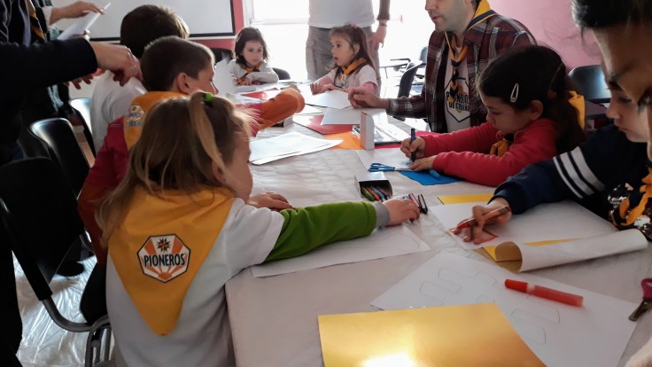 El sábado, los Pioneros de Cobeña se acercaron al local que la FundHOS tiene en la calle Camino de Madrid para confeccionar el mural «Hazte voluntario». Los niños comenzaron asistiendo un vídeo para luego poner manos a la obra en el cartel.