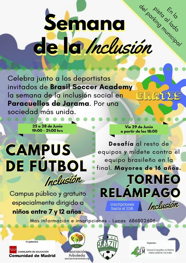 Del 24 de junio hasta el 1 de julio recibiremos la visita de nuestros amigos deportistas de la Brazil Soccer Academy. Ya hemos disfrutado de su compañía en 2016, participando de lo que se llamó Semana de Brasil, realizada por estas fechas en Cobeña (Madrid) y dejando muy buen sabor de boca. En su regreso, a pedido de unos vecinos de Paracuellos de Jarama que también son voluntarios de nuestra Asociación, la semana deportiva se trasladará a dicha localidad.