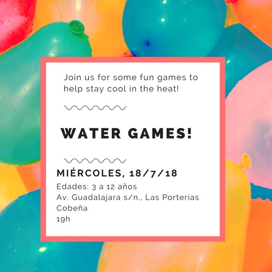 Este pasado miércoles 18 de julio sobre las 19 horas se ha llevado a cabo Water Games, una actividad en inglés con juegos de agua. Bajo la coordinación de Rebekah Ivester y un grupo de colaboradores de la Asociación hemos podido disfrutar junto a niños y padres de Cobeña y alrededores de una tarde espléndida.... Leer más →