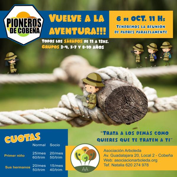 El programa de educación en valores de nuestra asociación inicia el curso 2018-2019. Enfocado en tres grupos de edades, Pioneros de Cobeña presenta un programa interesante y divertido con mucha vida al aire libre, excursiones y acampadas. Desde lo lúdico, apunta al desarrollo cultural del participante y sus aptitudes. A través de actividades prácticas y retos... Leer más →