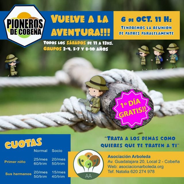 Paralelamente y en simultáneo, todos los padres interesados podrán participar de la reunión informativa en la que se tratarán todos lo detalles. Mientras tanto, solo decir que Pioneros de Cobeña en una actividad de educación en valores con un programa que equilibra diversión y logro y con mucha vida al aire libre, excursiones y acampadas. A través de actividades prácticas y retos semanales se desarrollan las destrezas asociadas a la naturaleza y las habilidades sociales, todo enmarcado en un sencillo principio vital: «Trata en todo a los demás tal y como quieres que te traten a ti».