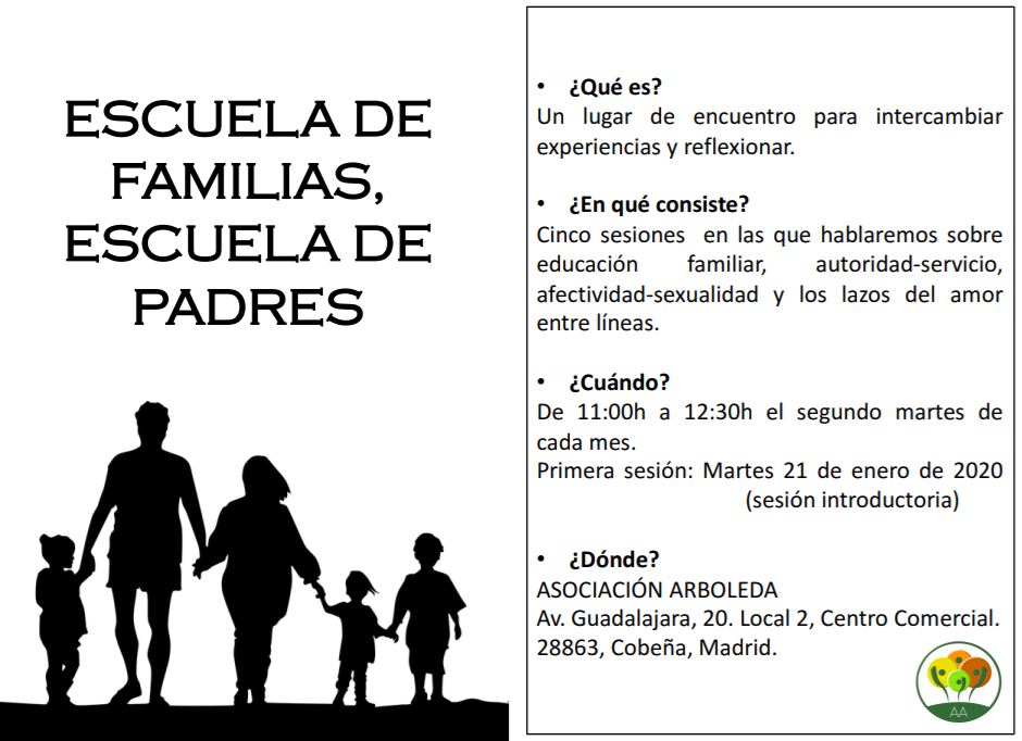 Los encuentros serán el martes 21 de enero de 2020 y luego, cada segundo martes de mes, finalizando en mayo, de 11:00 a 12:30h en el local de la Asociación Arboleda (Av. Guadalajara, 20, local 2, Centro Comercial de Cobeña).