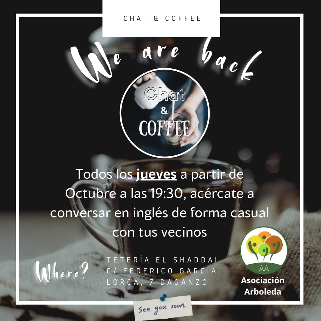 Desde el próximo 7 de octubre nuestro grupo de conversación Chat&Coffee se reúne todos los jueves a las 19:30h en la tetería El Shaddai, de Daganzo (C/ Federico García Lorca, 7).