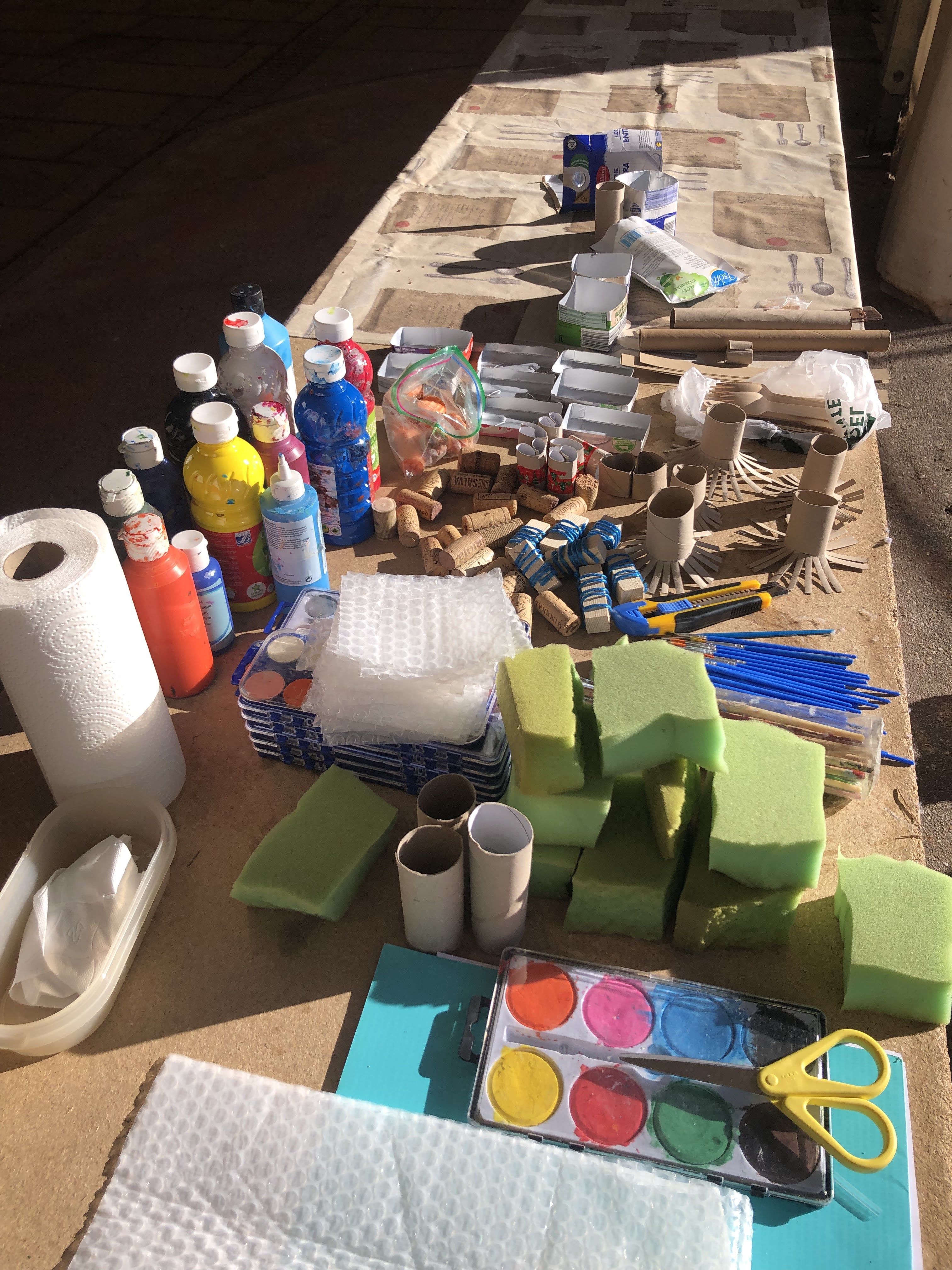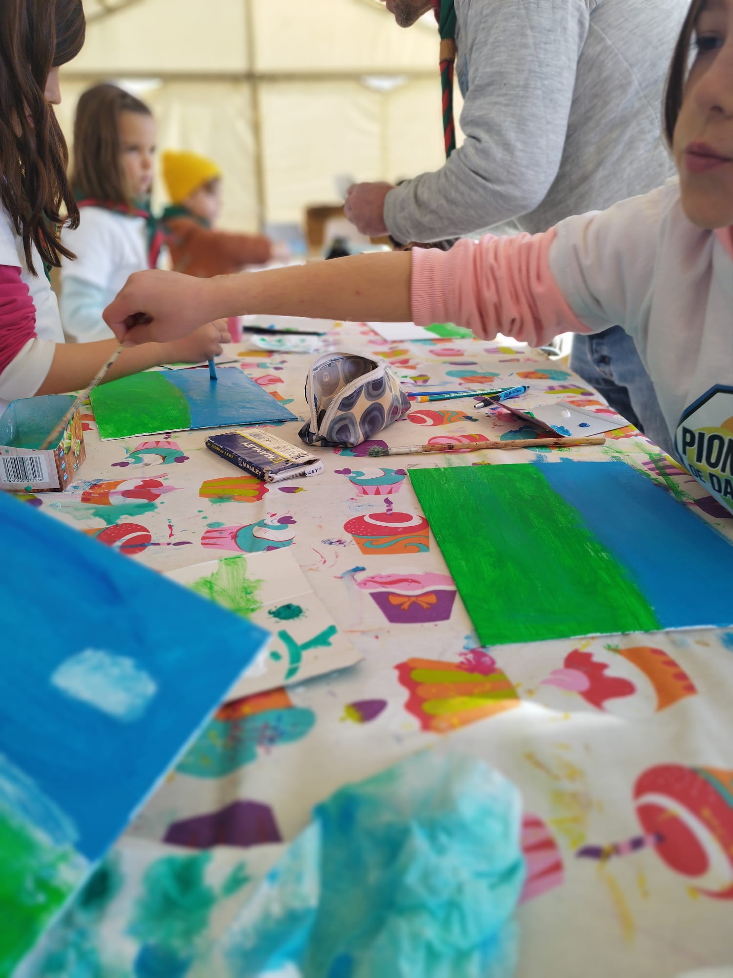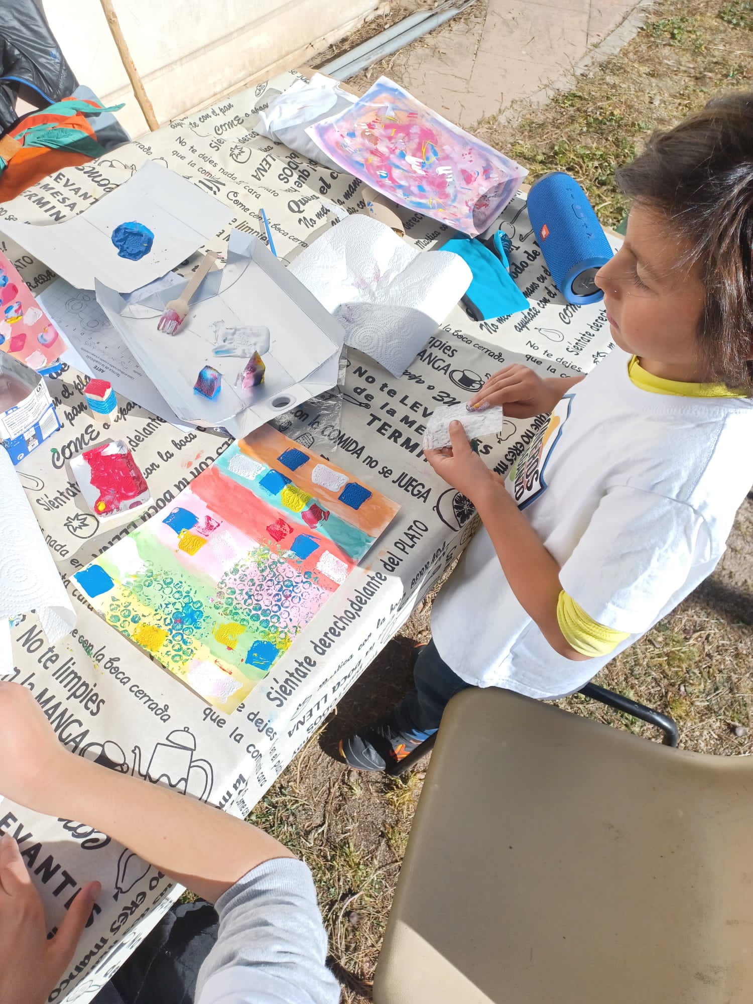 Aprendimos que existen diferentes técnicas de pintura, como el rayado, el puntillismo y el garabato, y diferentes tipos de pintura, como la acrílica. Un sábado también hemos experimentado en confeccionar y utilizar nuestros propios sellos.
